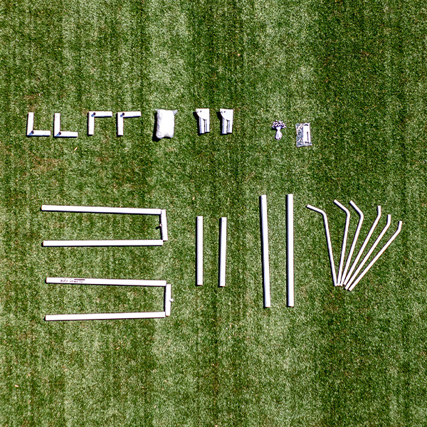 Built in a complete Aluminium construction using 68mm round aluminium piping, aluminium internal fixtures, and fittings, equipped with rubber pad on front posts for stability indoor and out.
